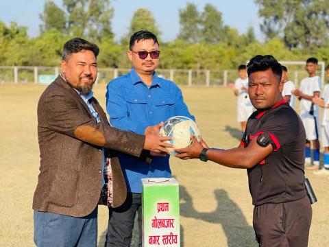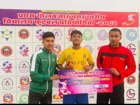 गोलबजार, ७ पुस। ‘प्रथम गोलबजार नगर स्तरीय बिद्यालय फुटबल प्रतियोगिता २०८२’ को उपाधी सृजना सेकेन्ड्री स्कुल गोलजबार ६ ले उचालेको छ। बालबिकास आवासीय बिद्यालय गोलबजार ८ चोहर्वा र सृजना स ...