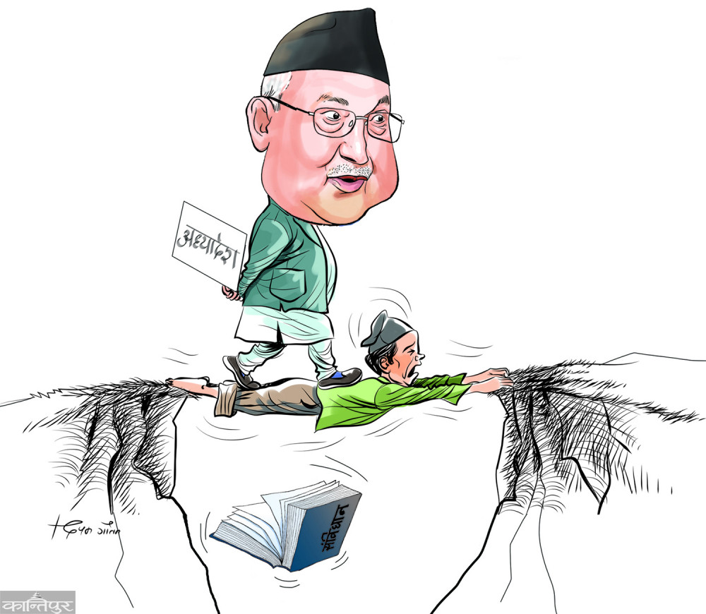 कानुन निर्माण गर्नुसट्टा अध्यादेशबाट मुलुक चलाउने प्रपञ्च : संविधानको धारा ३०४ मा संविधानसँग बाझिएका कानुनहरू संघीय संसद्को पहिलो अधिवेशन बसेको एक वर्षभित्रमा परिमार्जित गर्नुपर्ने, नगरेमा स्वतः अमान्य हुने व्यवस्था छ । संविधानको यस भावनाअनुसार काम गर्नु त कता हो कता, आवश्यक न्यूनतम कानुनहरू पनि बनाइएका छैनन् । नयाँ परिवर्तित स्थितिमा करिब ३१५ वटा ऐन पुनरवलोकन गरी संविधानअनुकूल बनाउनुपर्ने कानुन, न्याय तथा संसदीय मामिला मन्त्रालयले जनाएको थियो । तर हालसम्म केवल १५८ (ओली सरकार बनेपछि ६७) मात्र ऐन बनेका छन् । कानुन बनाउने निकाय प्रतिनिधिसभाको ओलीले पटक–पटक विघटन गरेका छन् । संसद्लाई बिजिनेस दिने काम सरकारको हो, तर संसद् चलेको अवस्थामा पनि संसद्लाई पंगु बनाउने हर्कतमा ओली सरकार लागिपर्यो । हाल ४९ वटा विधेयक संसद्मा विचाराधीन छन् । निजामती सेवा विधेयक, नागरिकता विधेयकलगायत कैयौं विधेयक संसद्को सम्बन्धित समितिबाट स्वीकृत भए पनि संसद्बाट स्वीकृत गराउनमा ओली सरकार लागेन । बरु अध्यादेशबाट मुलुक चलाउने प्रपञ्चमै रमायो । सार्वभौम संसद्को तेजोवध र कानुनी राज्यको उपहास हुने गरी हालसम्म ३३ वटा अध्यादेश ल्याइएका छन् । प्रदेश र स्थानीय तहकै सन्दर्भमा संघले एकल र साझा अधिकारसूचीमा रहेका कानुनहरू नबनाइदिनाले तिनलाई कानुन तर्जुमालगायतमा समस्या छ ।